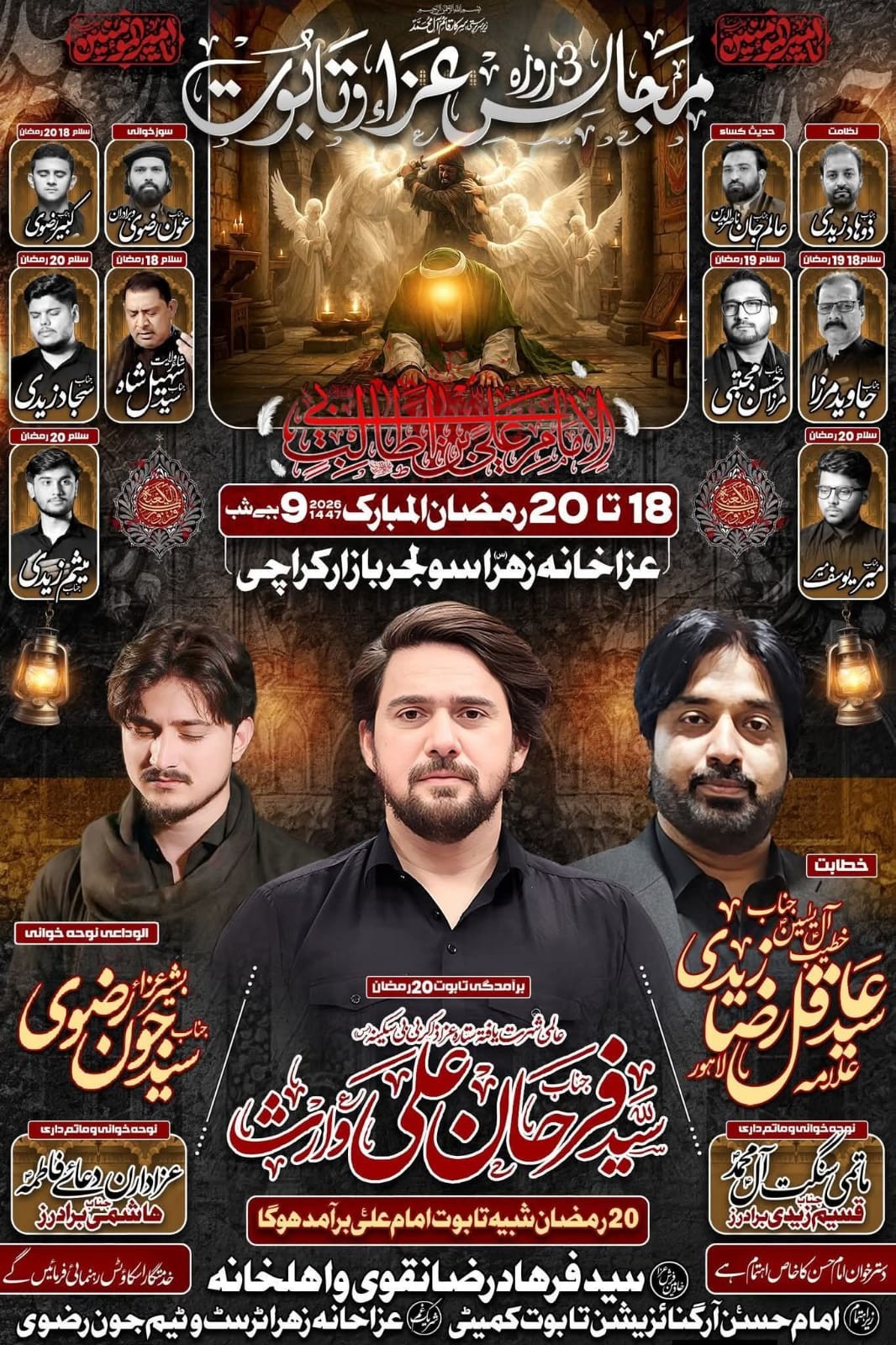 خادمین فرشِ عزاء: سید فرھاد رضا نقوی و اہلِ خانہ، امام حسنؑ آرگنازیشن(تابوت کمیٹی) ، عزاخانہ زہراؑ ٹرسٹ و ٹیم جون رضوی