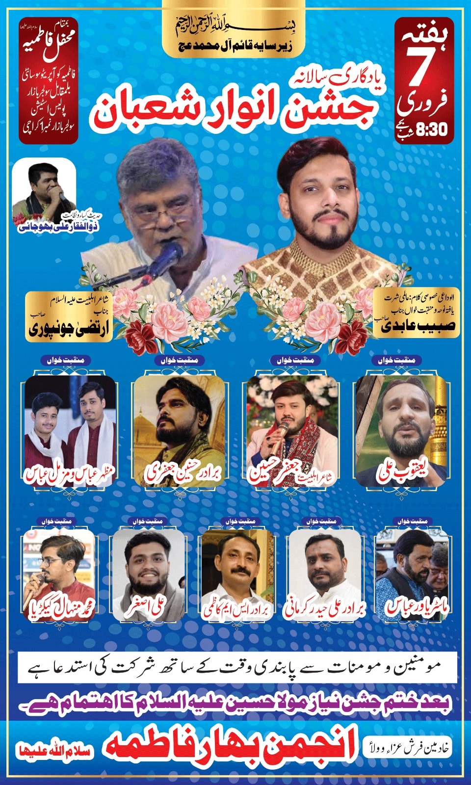 منقبت خواں: علی اصغر – برادر ایس ایم کاظمی – یعقوب رضا – برادر علی حیدر کرمانی – عابد خان صاحب – محمد منہال کیکڑیا –
