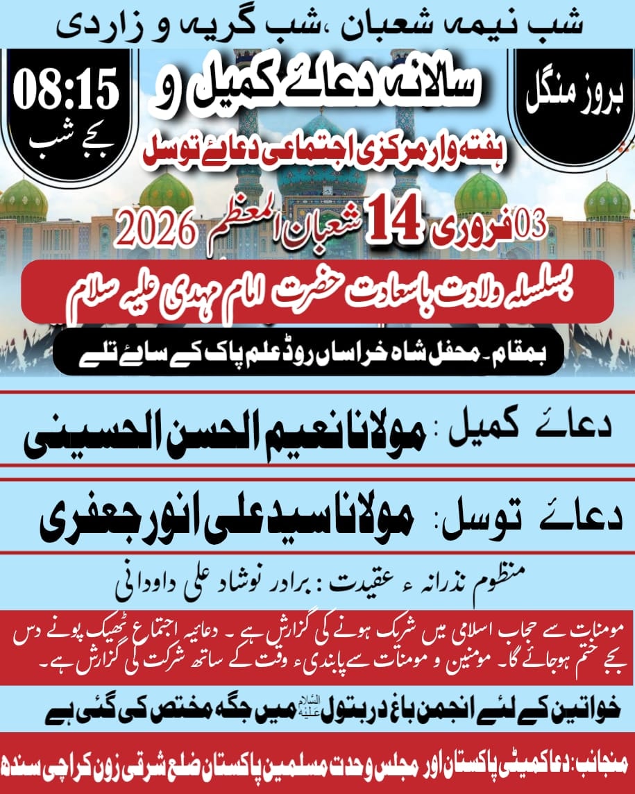 *شبِ نیمہءِ شعبان ،شبِ گریہ و زاری* *سالانہ دعائے کمیل و ہفتہ وار مرکزی اجتماعی دعائے توسل* *ولادت باسعادت حضرت امام مہدی علیہ السلام* *تلاوتِ دعائے کمیل:مولانا نعیم الحسن* *تلاوتِ دعائے توسل : مولانا سید علی انوار جعفری* *منظوم نذرانہ ء عقیدت : برادر نوشاد علی داودانی* *بروز:منگل* *03 فروری 2026* *14 شعبان المعظم 1447 ہجری* *بوقت : ٹھیک رات 8:15 بجے* *بمقام : علم مبارک کے سائے میں،خراسان روڈ، نمائش چورنگی سولجر بازار کراچی* *مومنات سے حجاب اسلامی میں شریک ہونے کی گزارش ہے۔(خواتین کے لئے انجمن باغ دربتولؑ میں جگہ مختص کی گئی ہے)* *دعائیہ اجتماع ٹھیک پونے دس بجے ختم ہوجائے گا۔ مومنین و مومنات سےپابندیء وقت کے ساتھ شرکت کی گزارش ہے۔* *(منجانب : دعا کمیٹی پاکستان اور مجلس وحدت مسلمین پاکستان ضلع شرقی ون کراچی سندھ)*
