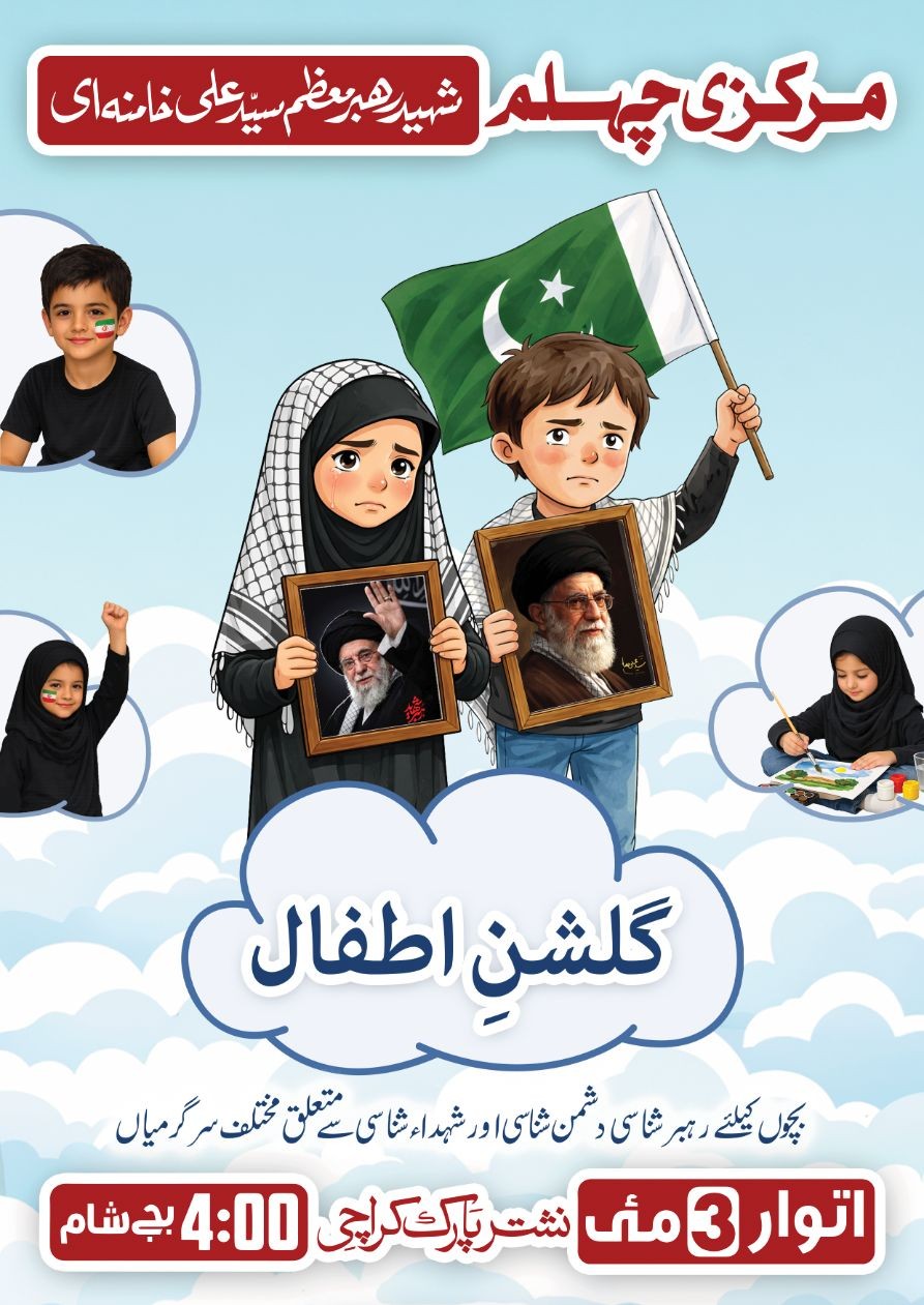 گلشن اطفال (کڈز کارنر) تین مئی کو نشتر پارک میں رہبرِ معظم سید شہید علی خامنہ‌ای کے چہلم کے سلسلے میں ایک خصوصی پروگرام منعقد کیا جا رہا ہے۔ اس پروگرام میں بچوں کے لیے خصوصی سرگرمیوں کا اہتمام کیا گیا ہے، تاکہ وہ رہبر شناسی اور دشمن شناسی شہداء شناسی جیسے اہم موضوعات سے آگاہ ہو سکیں۔ اس موقع پر “گلستانِ اطفال (کڈز کارنر)” کے تحت مختلف دلچسپ اور تعلیمی ایکٹیوٹیز بھی رکھی گئی ہیں۔ عمر کی حد: • لڑکے: 5 سال سے 8 سال • لڑکیاں: 5 سال سے 12 سال جو بچے ان سرگرمیوں میں حصہ لینے کے خواہشمند ہیں، وہ نیچے دیے گئے لنک کے ذریعے اپنی رجسٹریشن مکمل کریں۔ اپنے بچوں کو ایک بہترین تعلیمی اور تربیتی ماحول فراہم کریں!
