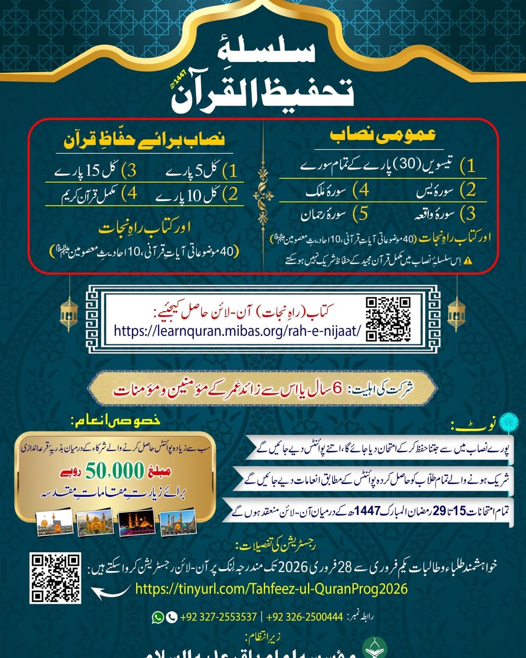 ❁ *سلسلۂِ تحفیظ القرآن 1447ھ* ❁ آن-لائن رجسٹریشن فارم لِنک: رابطہ نمبر: 0327-2553537 | 0326-2500444 *مؤسسہ امام باقر علیه السلام*