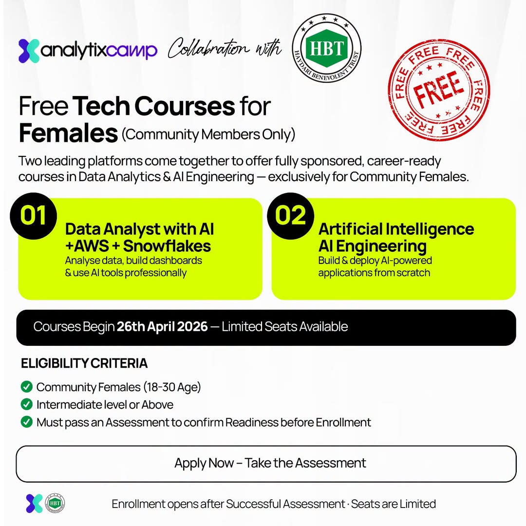In collaboration with 𝗛𝗮y𝗱a𝗿𝗶 𝗕𝗲𝗻𝗲𝘃𝗼𝗹𝗲𝗻𝘁 𝗧𝗿𝘂𝘀𝘁 (𝗛𝗕𝗧), 𝗔𝗻𝗮𝗹𝘆𝘁𝗶𝘅 𝗖𝗮𝗺𝗽 is proud to offer Two Specialized Certification Programs 𝗙𝗿𝗲𝗲 𝗼𝗳 𝗖𝗼𝘀𝘁 for 𝗖𝗼𝗺𝗺𝘂𝗻𝗶𝘁𝘆 𝗙𝗲𝗺𝗮𝗹𝗲 𝗦𝘁𝘂𝗱𝗲𝗻𝘁𝘀: