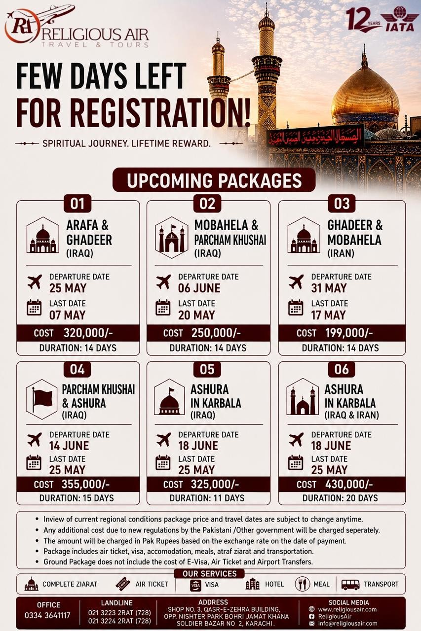 𝗨𝗣𝗖𝗢𝗠𝗜𝗡𝗚 𝗣𝗔𝗖𝗞𝗔𝗚𝗘𝗦 𝙁𝙀𝙒 𝘿𝘼𝙔𝙎 𝙇𝙀𝙁𝙏 𝙊𝙁 𝙍𝙀𝙂𝙄𝙎𝙏𝙍𝘼𝙏𝙄𝙊𝙉 ᴀʀᴀꜰᴀ & ɢʜᴀᴅᴇᴇʀ ᴏɴʟʏ ɪʀᴀQ 320,000/- (14 ᴅᴀʏꜱ) ᴅᴇᴘᴀʀᴛᴜʀᴇ : 25 ᴍᴀʏ ʟᴀꜱᴛ ᴅᴀᴛᴇ : 7 ᴍᴀʏ ᴍᴏʙᴀʜᴇʟᴀ & ᴘᴀʀᴄʜᴀᴍ ᴋʜᴜꜱʜᴀɪ ᴏɴʟʏ ɪʀᴀQ 250,000/- (14 ᴅᴀʏꜱ) ᴅᴇᴘᴀʀᴛᴜʀᴇ : 6 ᴊᴜɴ ʟᴀꜱᴛ ᴅᴀᴛᴇ : 20 ᴍᴀʏ ɢʜᴀᴅᴇᴇʀ & ᴍᴏʙᴀʜᴇʟᴀ ᴏɴʟʏ ɪʀᴀɴ 199,000/- (14 ᴅᴀʏꜱ) ᴅᴇᴘᴀʀᴛᴜʀᴇ : 31 ᴍᴀʏ ʟᴀꜱᴛ ᴅᴀᴛᴇ : 17 ᴍᴀʏ ᴘᴀʀᴄʜᴀᴍ ᴋʜᴜꜱʜᴀɪ & ᴀꜱʜᴜʀᴀ ᴏɴʟʏ ɪʀᴀQ 355,000/- (15 ᴅᴀʏꜱ) ᴅᴇᴘᴀʀᴛᴜʀᴇ : 14 ᴊᴜɴ ʟᴀꜱᴛ ᴅᴀᴛᴇ : 25 ᴍᴀʏ ᴀꜱʜᴜʀᴀ ᴏɴʟʏ ɪʀᴀQ 325,000/- (11 ᴅᴀʏꜱ) ᴅᴇᴘᴀʀᴛᴜʀᴇ : 18 ᴊᴜɴ ʟᴀꜱᴛ ᴅᴀᴛᴇ : 25 ᴍᴀʏ ᴀꜱʜᴜʀᴀ ɪʀᴀQ/ɪʀᴀɴ 430,000/- (20 ᴅᴀʏꜱ) ᴅᴇᴘᴀʀᴛᴜʀᴇ : 18 ᴊᴜɴ ʟᴀꜱᴛ ᴅᴀᴛᴇ : 25 ᴍᴀʏ Contact: 021 32232RAT (728) | 32242RAT (728) | 0334-3641117 Ali Abbas Panjwani (0334-3641117) | Muntazir Mehdi (0318-2873950) | Aun Ali (0333- 3184807) info@religiousair.com