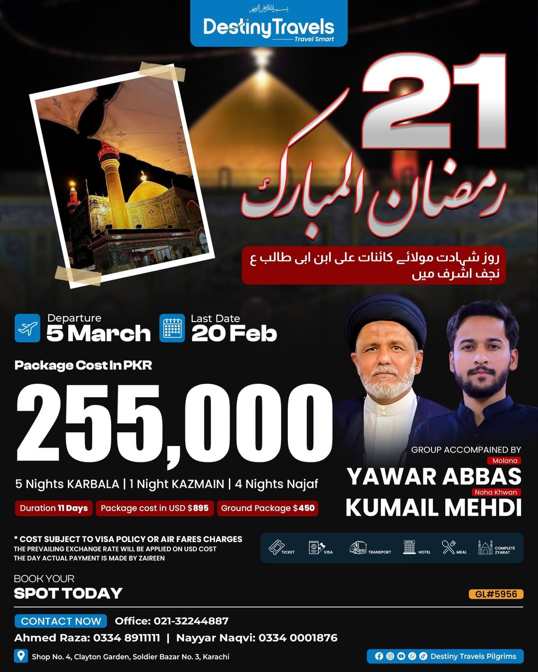 21 رمضان المبارک عراق زیارت گروپ روز شہادت امیرالمومنین حضرت امام علی ابن ابیطالب ع نجف میں 11 Days Ziyarat Package PKR 255,000/- Departure: 05 March Last Date: 20 February ————————– Karbala (5N) | Kazmain (1N) | Najaf (4N) With Molana Syed Yawar Abbas Zaidi Noha Khwan Kumail Mehdi ————————————– Limited seats — Book your spot now! 0334-8911111 | 0334-0001876