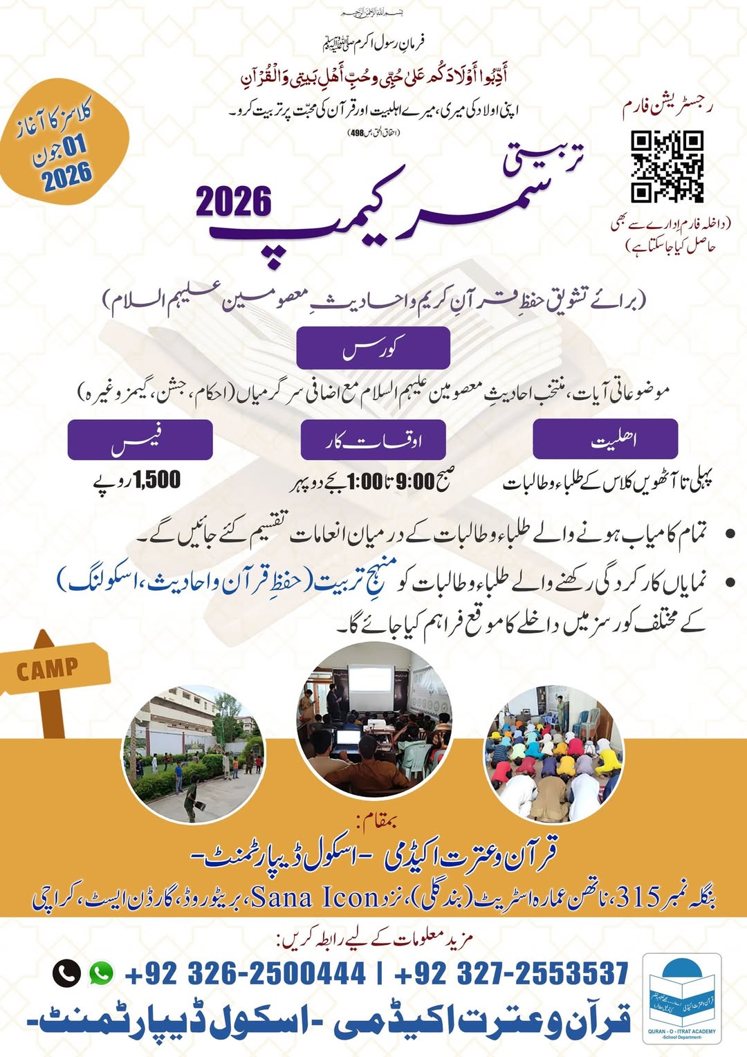 _*تربیتی سمر کیمپ 2026*_ مزید معلومات کے لئے رابطہ فرمائیں! 0326-2500444 | 0327-2553537 *قرآن و عترت اکیڈمی -اسکول ڈیپارٹمنٹ-*