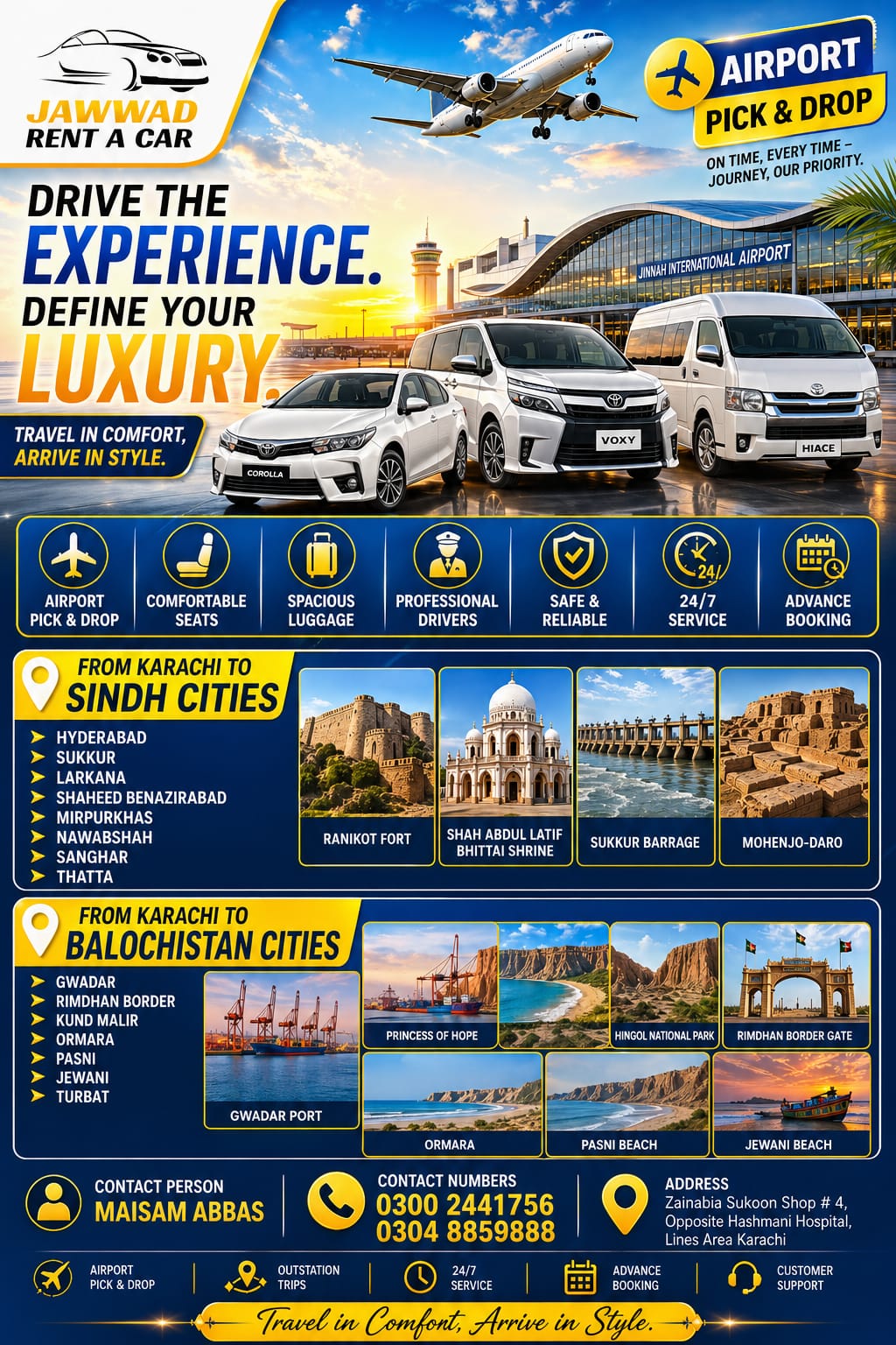 #JawwadRentACar #AirportPickDrop #RentACarKarachi #VoxyNoah #HiaceRental #RentACarBalochistan #RentACarSindh #Karachi #Gwadar #TravelPakistan