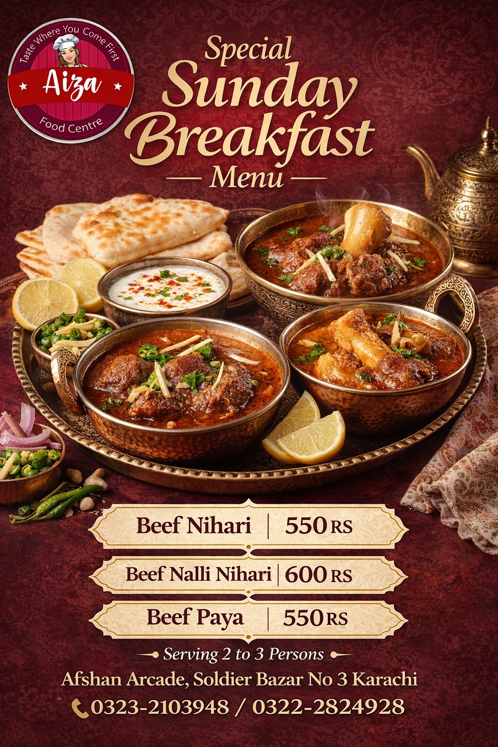 Aiza Food Center Every Sunday Special Breakfast Menu Beef Nehari Rs 550 Beef Nulli Nehari Rs 600 Beef Paya Rs 550 (2-3 Person Serving) Order above Rs 1500 get free Colddrink 300ml. Order first come first serve basis Join our WhatsApp community for regular updates For order contact Aiza Food Center 03232103948 03222924928
