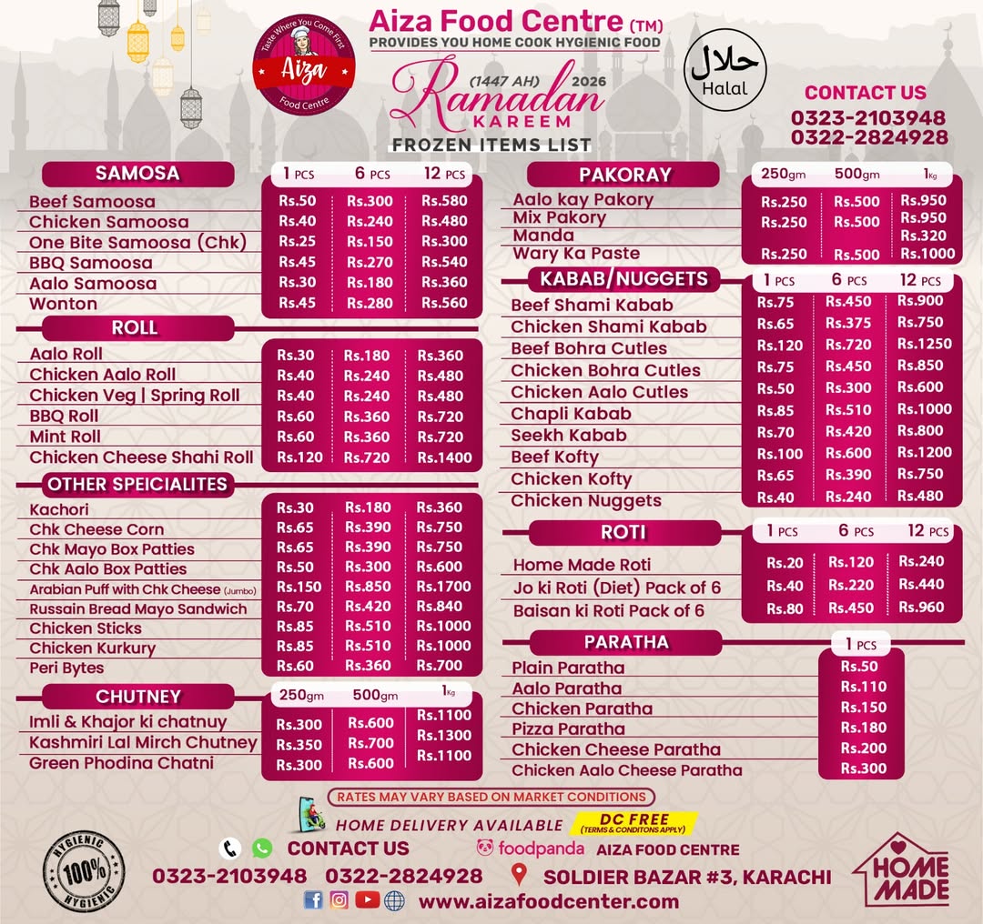 Aiza Food Center Frozen Item List Ramzan 2026 This Ramzan Aiza Food Center provides all Frozen Items with Quality and 100% Hygenic. Join us our WhatsApp community for daily updates For order contact Aiza Food Center 03232103948 03222824928