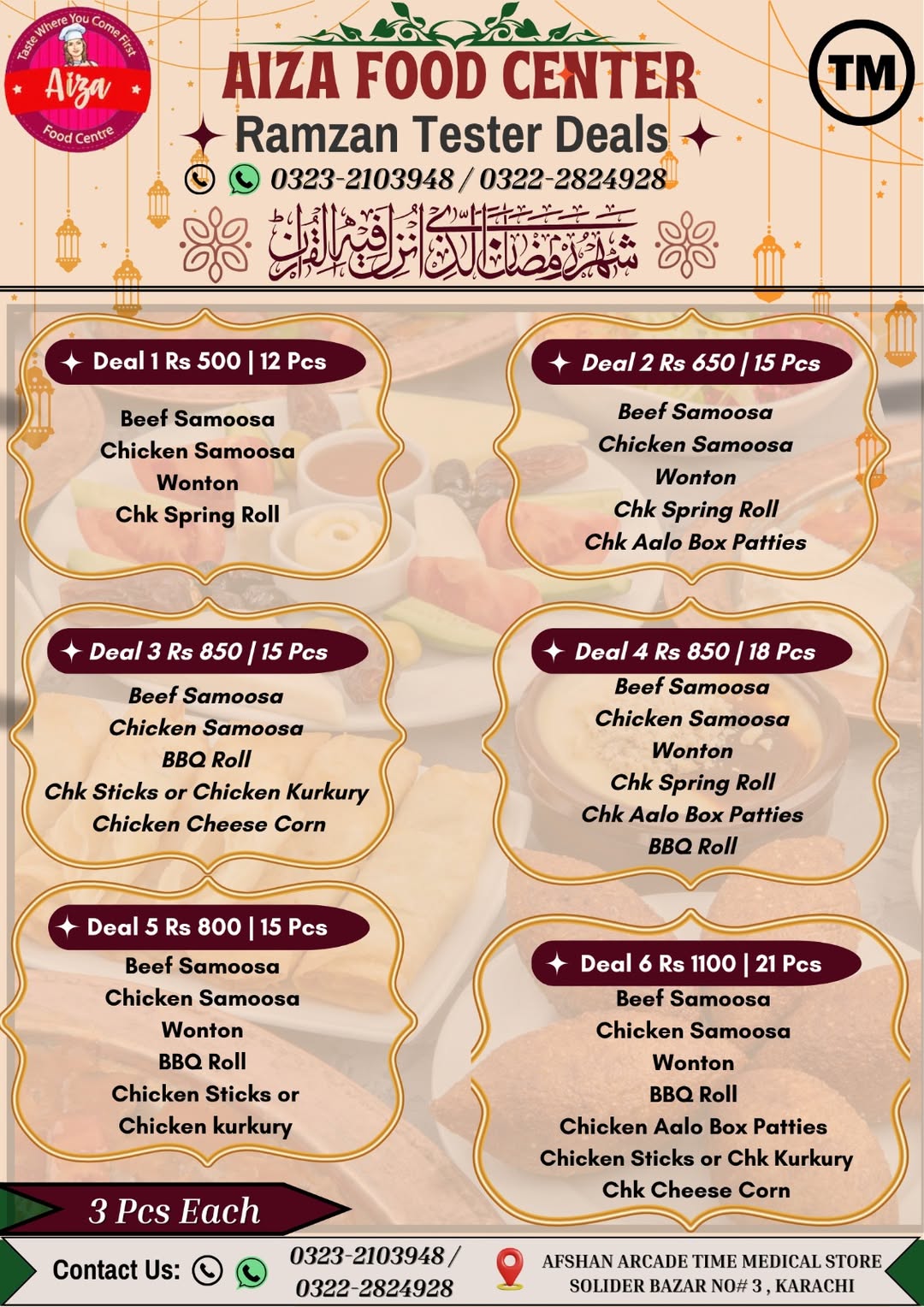 Aiza Food Center Ramzan Tester Deal Deal 1 Rs 500 Deal 2 Rs 650 Deal 3 Rs 850 Deal 4 Rs 850 Deal 5 Rs 800 Deal 6 Rs 1100 Join us our WhatsApp community for daily updates For order contact Aiza Food Center 03232103948 03222824928