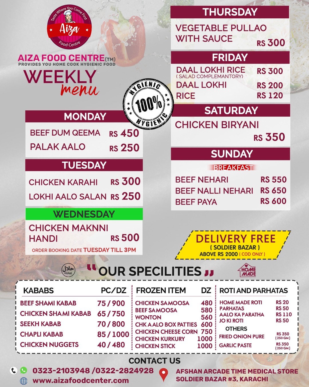 Aiza Food Center Weekly Home Made Monday BEEF DUM QEEMA Rs 450/= Palak Aalo Salan Rs 250 Tuesday Chicken Karahi Rs 300/= Lokhi Aalo Salan Rs 250 Wednesday (ORDER BOOKING TILL TUESDAY 3 PM) Chiicken Handi Rs 500 (in box) Rs 900 ( Handi) Thursday Vegtable Pullao with Sauce Rs 300/= Friday Daal Lokhi Rice Rs 300 Daal Lokhi Rs 200 Rice 120 Saturday Chicken Biryani Rs 350 PRE ORDER DAILY Chicken Salad Rs 300 / 500 _____________ Sunday Breakfast ( 9 am onwards ) only pre order booking Breakfast Serving 1-2 Person Beef Nehari Rs 550 Beef Nulli Nehari Rs 600 Beef Qeema Fry Speical Rs 450 White Rice Rs 120/= Homemade Roti Rs 20/= __________ All Fresh Frozen Items are available For update join our Community for daily updates Link For Online Order through our website www.aizafoodcenter.com For Contact Aiza Food Center 0323 2103948 0322 2824928