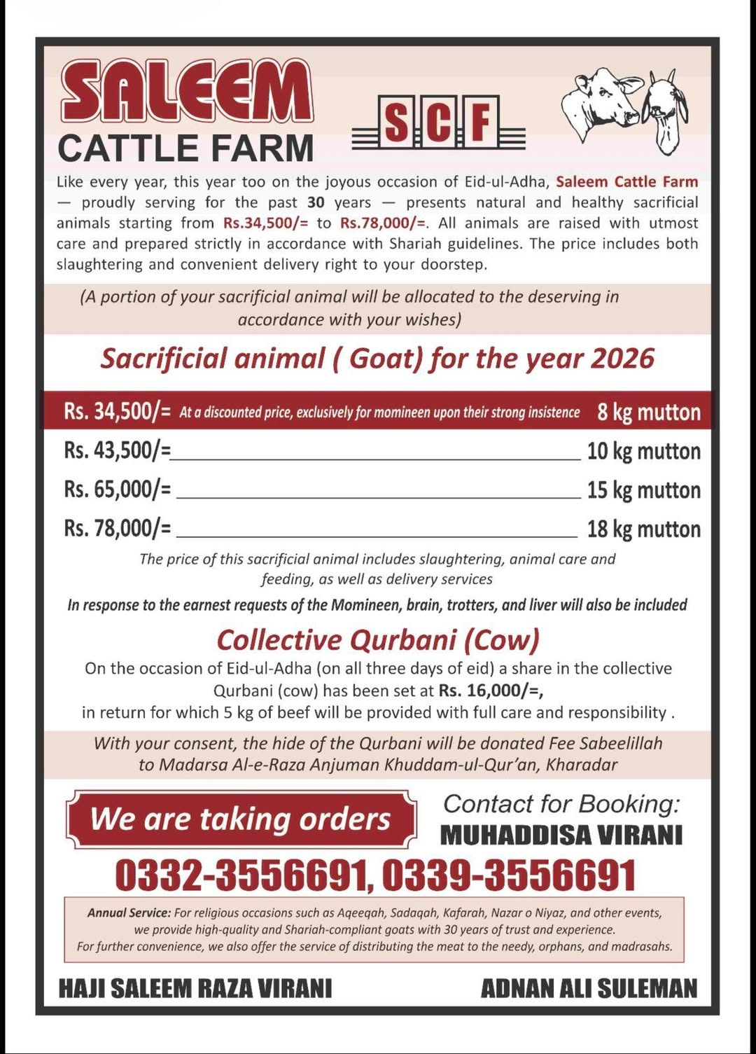 Alhamdulillah, With the Blessings of Almighty Allah swt & Chahrdah Masoomeen a.s On the blessed and auspicious occasion of *Wiladat-e-Imam Raza (A.S.)*, *Saleem Cattle Farm* is pleased to announce the *Qurbani Rate List for 2026*. Like every year, we are honored to serve the Momineen with complete care, responsibility, and Shariah-compliant arrangements. Bookings are now open. May Allah accept everyone’s efforts and sacrifices.