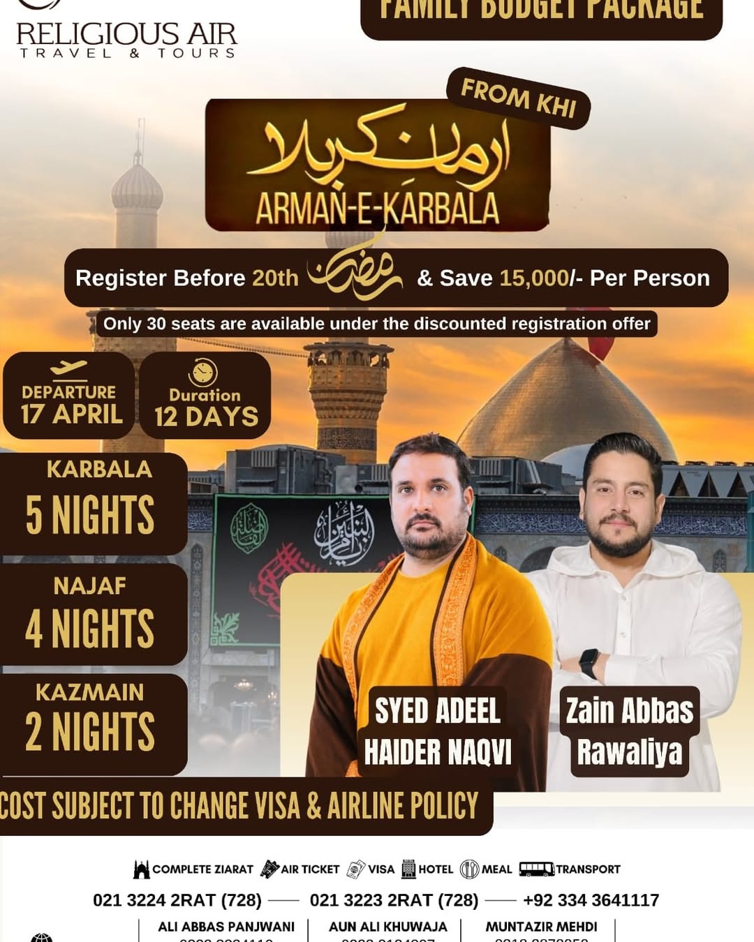 ARMAN-E-KARBALA 2026 Exclusive Family Budget Ziyarat Package – Iraq Ramadhan Early Booking Advantage. Register before 20th Ramadhan & save 15,000/- per person. Only 30 seats available under the discounted registration offer. Departure: 17 April Duration: 12 Days Karbala – 5 Nights Najaf – 4 Nights Kazmain – 2 Nights • Family-friendly itinerary with maximum comfort. • Exclusive spiritual sessions with renowned Manqabat Khuwans. • Stay near the holy shrines for easy access to Ziarats. • Limited discounted seats – first come, first served. Spiritual Recitations & Manqabat By: • Syed Ali Raza Moosavi • Syed Ali Azmat Zaidi • Syed Adeel Haider Naqvi • Zain Abbas Rawaliya For booking & further details! Contact: 021 32232RAT (728) | 32242RAT (728) | 0334-3641117 Ali Abbas Panjwani (0334-3641117) | Muntazir Mehdi (0318-2873950) | Aun Ali (0333- 3184807) info@religiousair.com