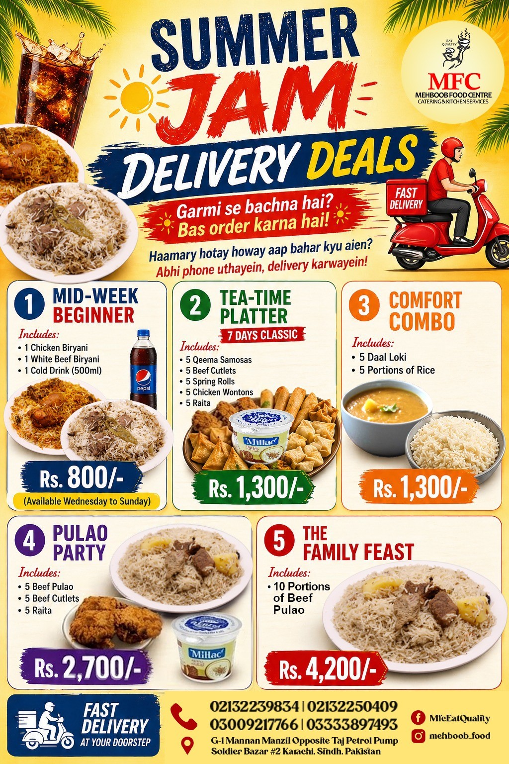 Garmi se pareshan? Bahar jaanay ki zarurat hi nahi! Bas **order karein aur thandi rahat ghar par hasil karein** Ham hain na — aap kyun bahar niklein? Abhi call karein aur garma garam, fresh delivery hasil karein: 021-32239834 021-32250409 0300-9217766 0333-3897493 **MFC Special Delivery Deals — ab aur bhi behtareen!** MFC — *Eat Quality*