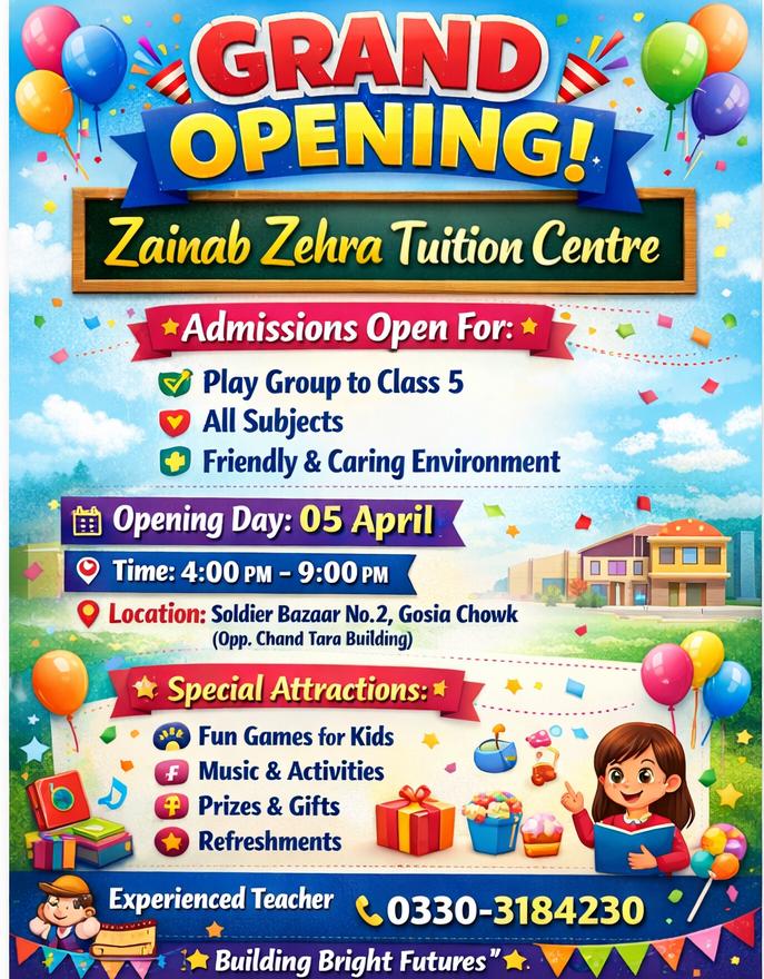 GRAND OPENING Zainab Zehra Tution centre Admissions Open for: * Play Group to Class 5 * All Subjects * Friendly & Caring Environment Opening Day: 05 April Time: 4:00 say 9:00 Location: Soldier bazaar no 2 Gosia Chowk opposite Chand Tara building Special Attractions: * Fun Games for Kids * Music & Activities * Prizes & Gifts * Refreshments Opening Day Offer: Free 1 day Demo Classe Discount for First 10 Students Experienced Teacher Contact: 03303184230 “Building Bright Futures”