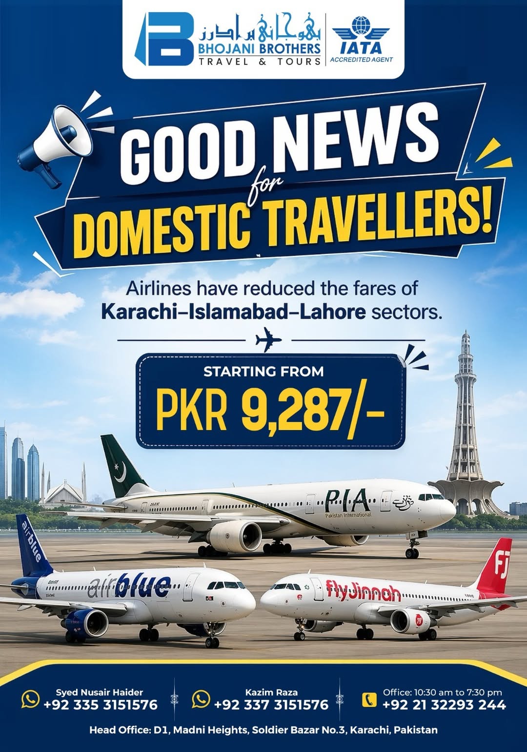* Great News for Domestic Travelers! * Travel just got more affordable! Airfares for *Karachi Islamabad Lahore* routes have been reduced *Tickets starting from only PKR 9,287/-* Don’t miss this limited-time offer — book now and save more on your travel! * Contact Now:* Syed Nusair Haider: +92 335 3151576 Kazim Raza: +92 337 3151576 Office: +92 21 32293 244 Head Office: D1, Madni Heights, Soldier Bazar No.3, Karachi Secure your seat today before fares increase!