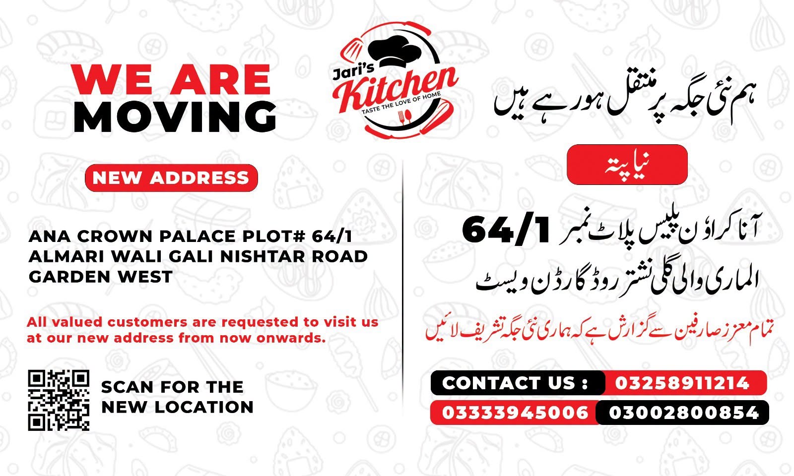 Dear valued Customers, we are pleased to announce that *_Jari’s Kitchen & Catering_* is shifting to a *New Location*💫
