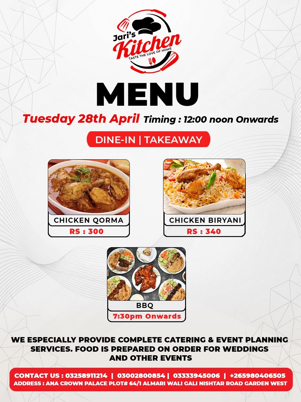 MENU FOR TUESDAY 28TH APRIL