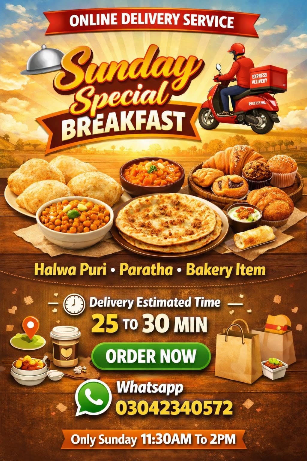 Now We Are Providing Sunday Breakfast!!! Delivery Service Only Soldier Bazar and Lines Area. Orders Can Be Placed Either One Day In Advance Or Same Day, As Per Your Convenience. However, Urgent Delivery Is Not Available. Estimated Delivery Time 25 To 30 Minutes After Placing Your Order. WhatsApp 03042340572
