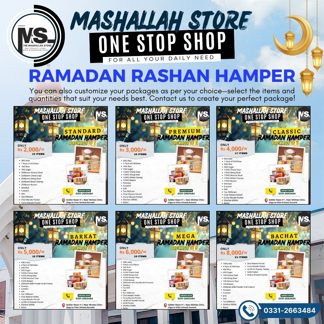 * Ramadan Rashan Hampers with Special Discounted Rates* You can also customize your packages as per your choiceβ€”select the items and quantities that suit your needs best. Contact us to create your perfect package! *5% Special Bumper Discount on Any of the Package – Minimum 100 Rashan Bags* Click here, Complete Package Details Contact us now to avail this Special Discount…!!! 0331-2663484 OR 0334-1833931