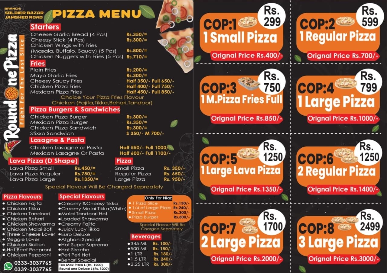 Round One Pizza Soldier Bazar & Jamshed Road Branch Serving you the Best Quality Pizza In Karachi With Best Taste . 0333-3037765 0339-3037765 If Any Complain Of Food will Replace You Or Refund Your Money Complain Number 0339-3037765