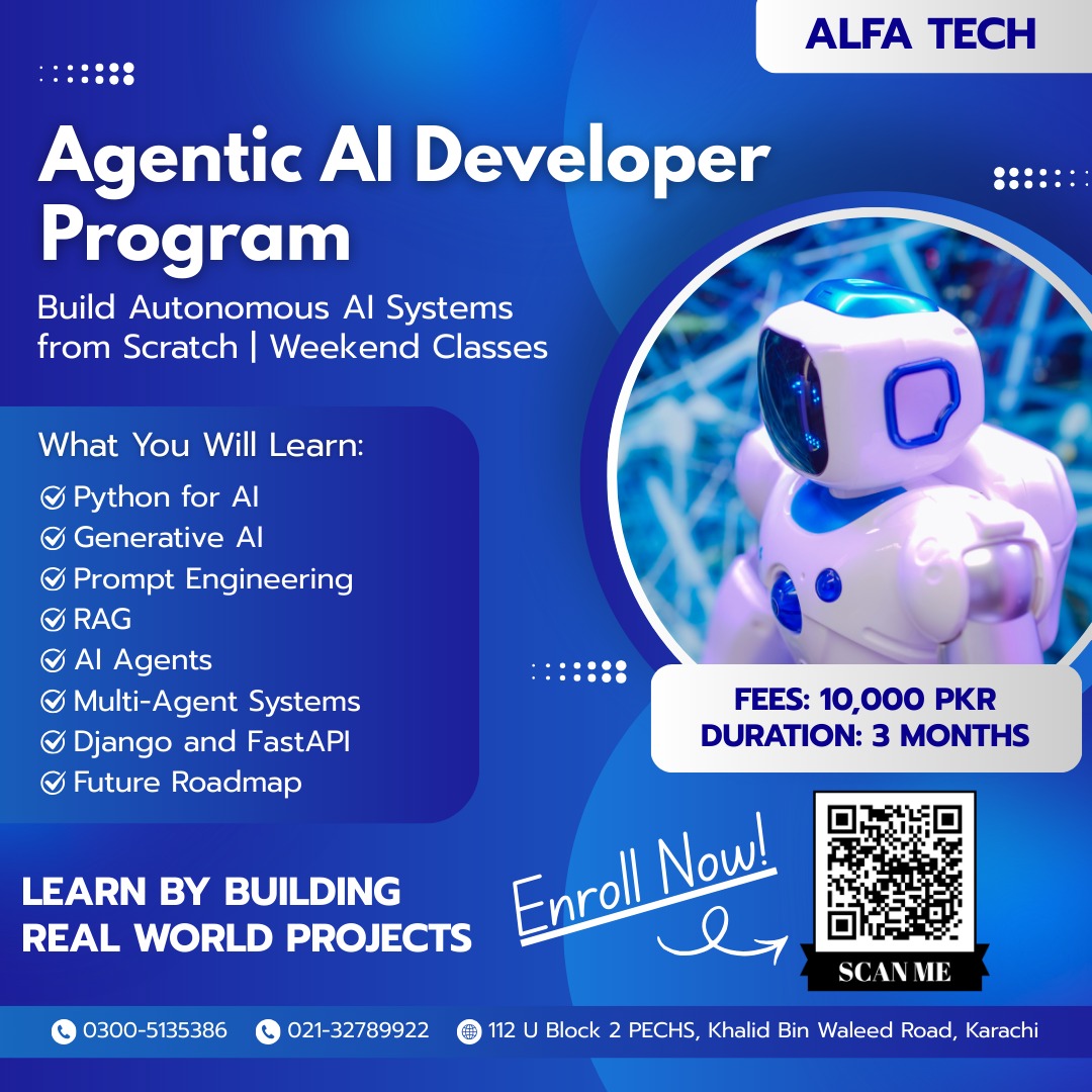 🚀 Alfa Tech proudly presents the Agentic AI Developer Program — a 3-Month technical training designed to take you from beginner level to building real AI agents using Python, LLMs, and modern agent frameworks.