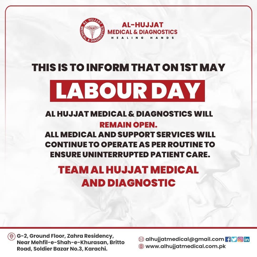 This is to inform that on 1st May, Labour Day, Al Hujjat Medical & Diagnostics will remain open as usual.