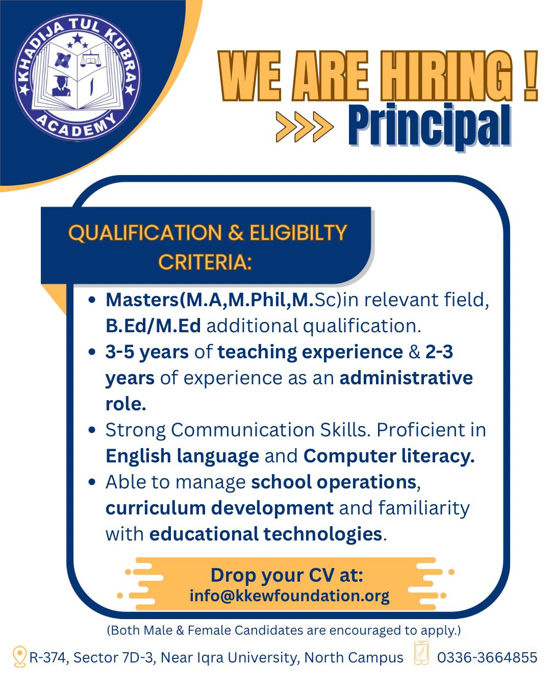 WE ARE HIRING! Khadija Tul Kubra Academy invites applications from qualified and experienced education leaders for the position of Principal. Join us in fostering academic excellence and holistic development.