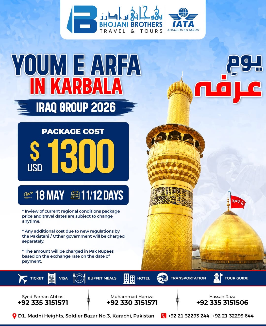 Youm-e-Arfa in Karbala 2026 A spiritual journey you’ll never forget… Join our Iraq Group 2026 and experience the blessings of Karbala on this sacred occasion. Departure: 18 May Duration: 11/12 Days Package Cost: $1300 USD Package Includes: Ticket | Visa | Buffet Meals | Hotel | Transportation | Tour Guide Limited seats available – Book early to secure your spot! Contact Now: Syed Farhan Abbas: +92 335 3151571 Muhammad Hamza: +92 330 3151571 Hassan Raza: +92 335 3151506 Landline: +92 21 32293 244 | +92 21 32293 644 Office: D1, Madni Heights, Soldier Bazar No.3, Karachi Note: Prices & dates may vary due to regional conditions. Payments in PKR as per current exchange rate. Don’t miss this opportunity to be part of a soulful pilgrimage. Book today!